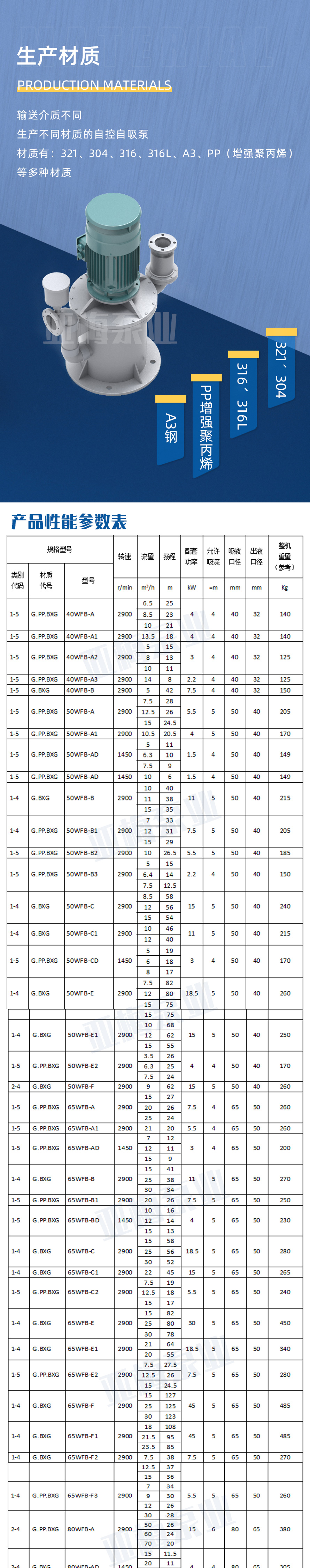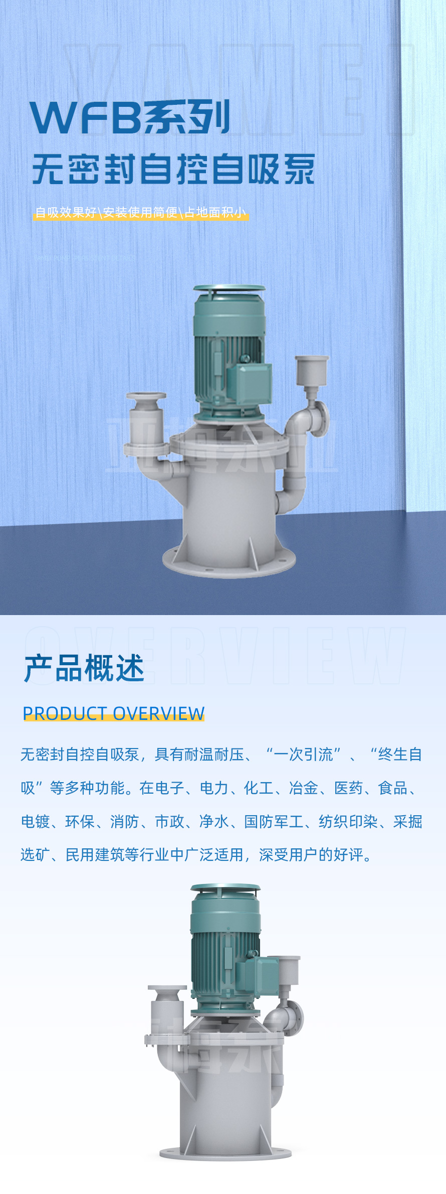 WFB系列無密封自控自吸泵,具有耐溫耐壓、“一次引流”、“終生自吸”等多種功能。目前生產(chǎn)321、304、316、316L、A3、PP(增強聚丙烯)等多種材質的系列整機,五種不同造型共一千余種規(guī)格。在電子、電力、化工、冶金、醫(yī)藥、食品、電鍍、環(huán)保、消防、市政、凈水、國防軍工、紡織印染、采掘選礦、民用建筑等行業(yè)中廣泛適用,深受用戶的好評。
