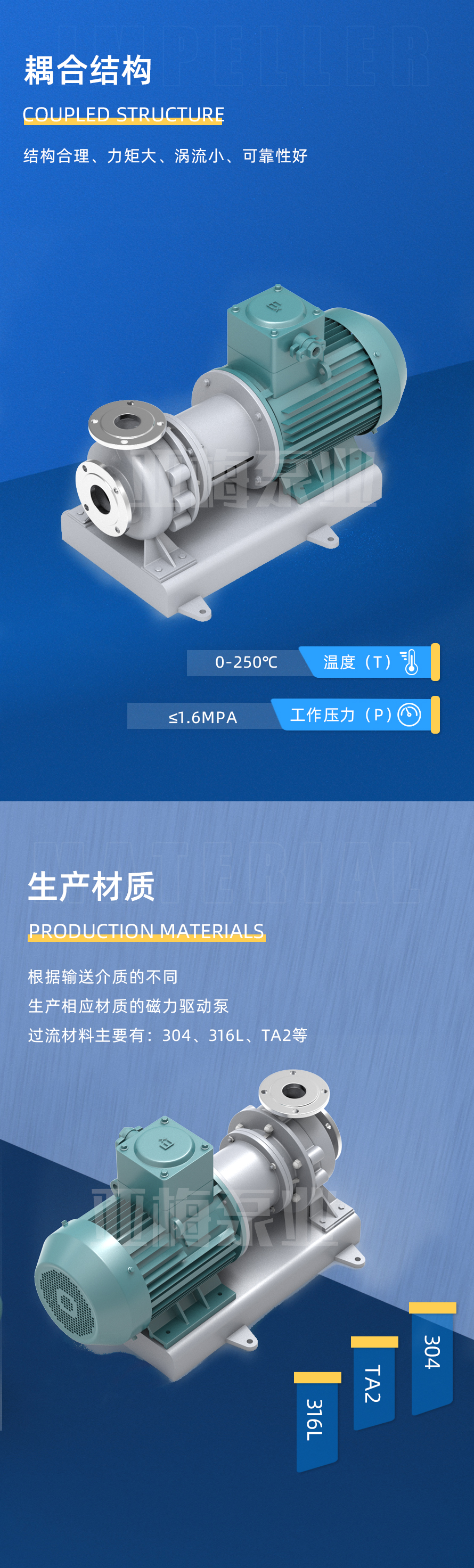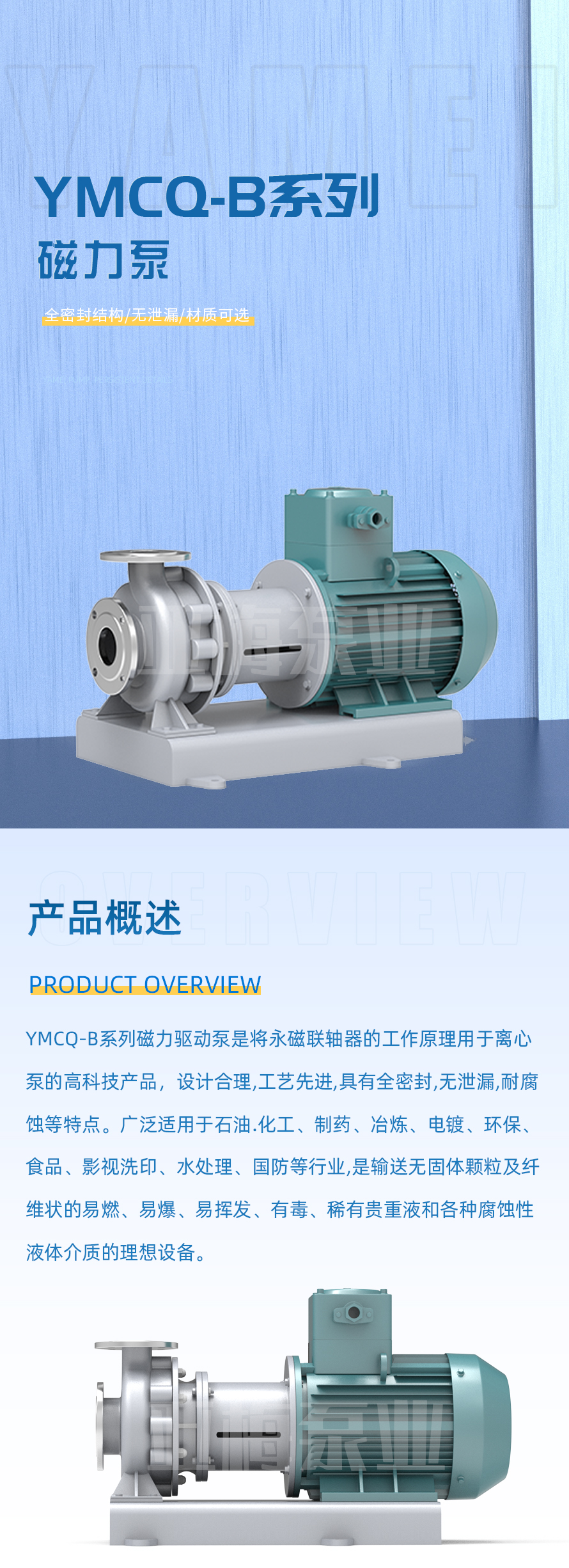 YMCQ-B系列磁力驅動泵是將永磁聯(lián)軸器的工作原理用于離心泵的高科技產品,設計合理,工藝先進,具有全密封,無泄漏,耐腐蝕等特點。