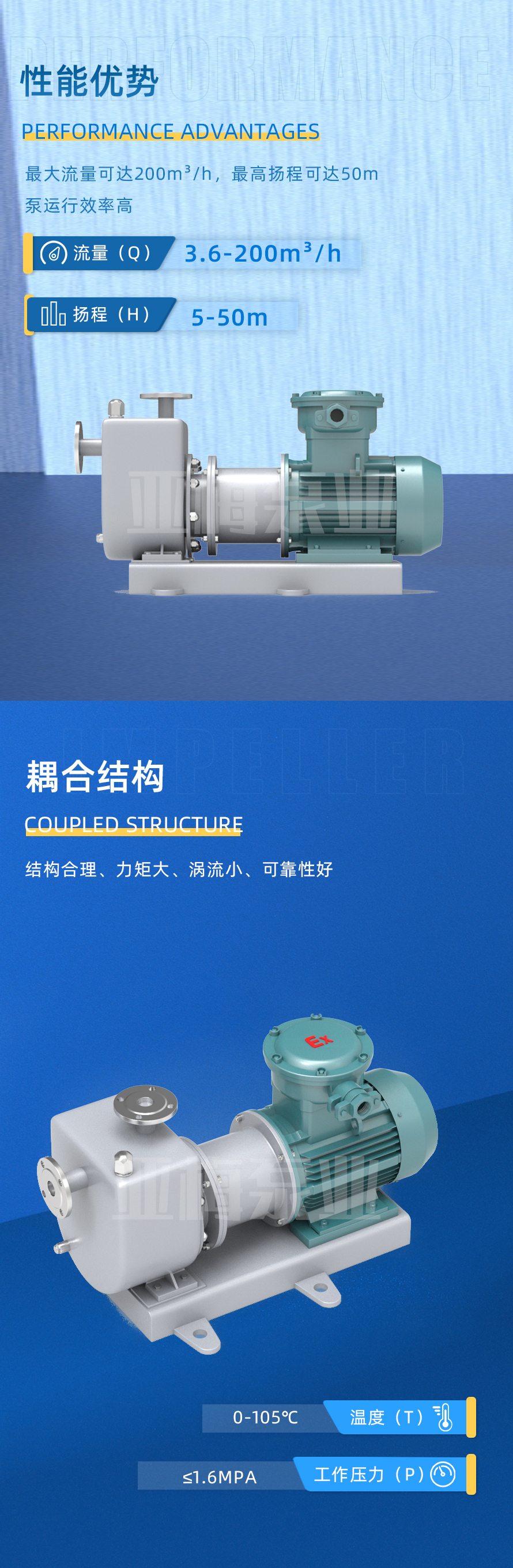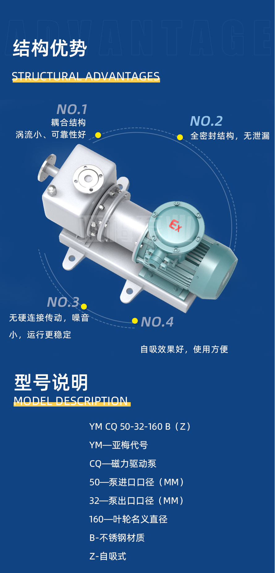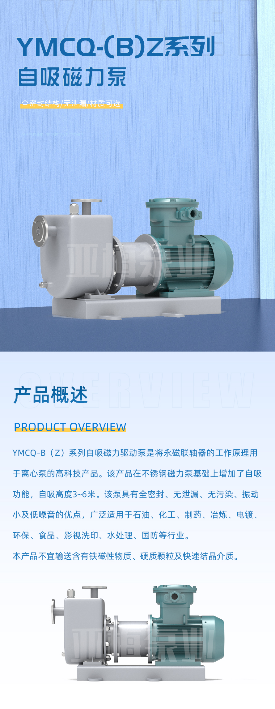 亞梅泵業YMCQ系列磁力驅動泵是將永磁聯軸器的工作原理用于離心泵的高科技產品,設計合理,工藝先進,具有全密封,無泄漏,耐腐蝕等特點。